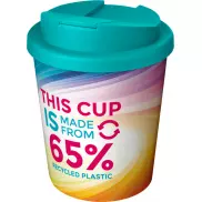 Izolowany kubek o podwójnej ściance ze szczelną zakręcaną pokrywą i pełnokolorowym wzorem na całej powierzchni wtopionym w produkt. Wykonany w 65% z materiałów pochodzących z recyklingu (kubek i czarna wkładka) ze standardową plastikową pokrywką. Kubek w pełni nadaje się do recyklingu i można go używać w zmywarce i kuchence mikrofalowej. Pojemność: 250 ml. Wolne od BPA. Zapakowana w torbę, którą można kompostować w domu. Wyprodukowano w Wielkiej Brytanii.